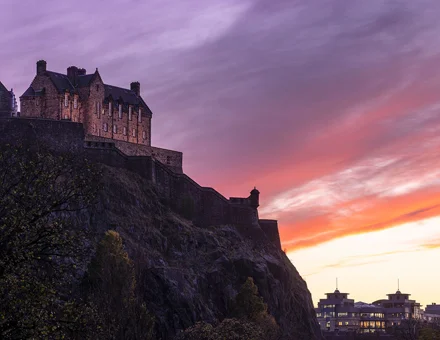 A historic fortress perched atop Castle Rock, dominating the skyline of Scotland’s capital city.