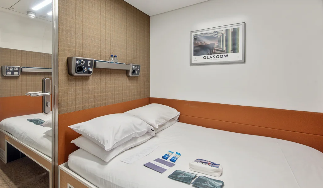 Our flagship room features a double bed with a handcrafted Glencraft mattress and an en-suite shower room. Enjoy priority access to the Club Car and station lounge access before and after you travel. Complimentary breakfast included in the Club Car or delivered to your room.
