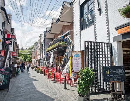 A charming, cobbled street located in the West End of Glasgow, renowned for its vibrant atmosphere, eclectic mix of bars, restaurants, and cafes.
